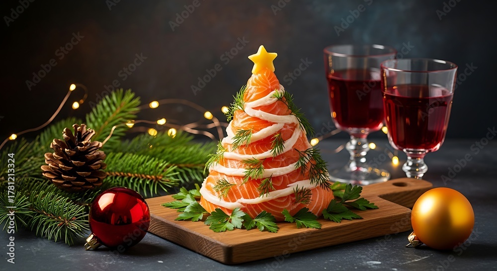 Photo of a festive christmas appetizer shaped like a fir tree, made of smoked salmon and garnished with herbs, served on a wooden board with festive decorations #1781213324