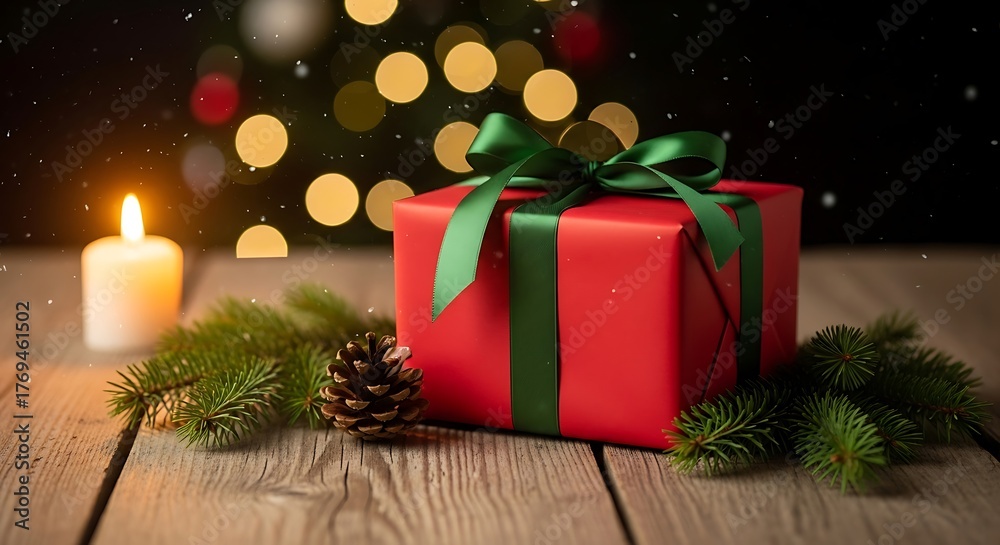 Photo of a festive red gift box tied with a green ribbon sits on a wooden table, adorned with pine branches and a pinecone, with a lit candle and bokeh lights in the background, creating a cozy christ #1769461502