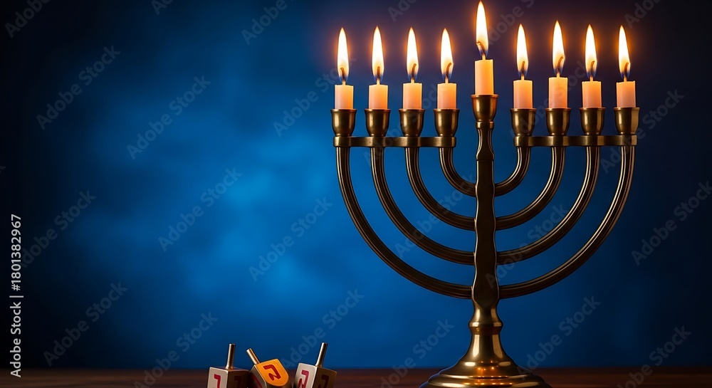 Photo of a golden menorah with nine lit candles glows brightly against a dark, textured blue background, with small chocolate gelt and a flower at its base #1801382967