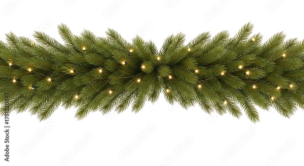 Photo of a lush green fir garland adorned with warm, glowing fairy lights, perfect for festive christmas and holiday season decoration #1781220847