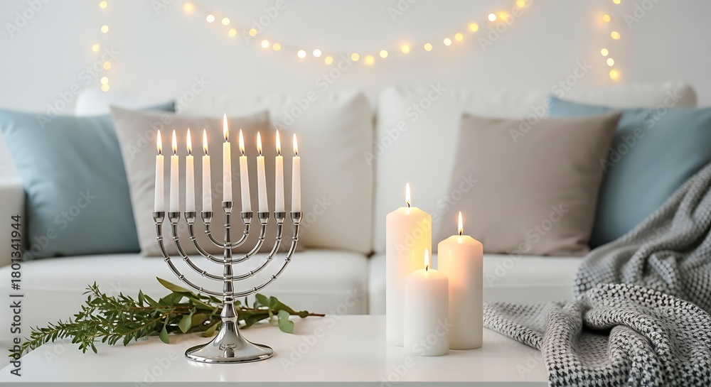 Photo of a menorah with lit candles stands on a table, adorned with greenery, with a couch and decorative lights in the background, creating a warm and festive atmosphere for hanukkah #1801341944