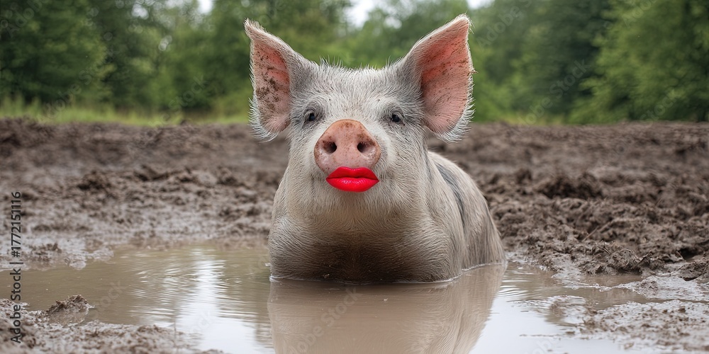 photo of a pig with red lipstick sitting in mud smiling #1772151116