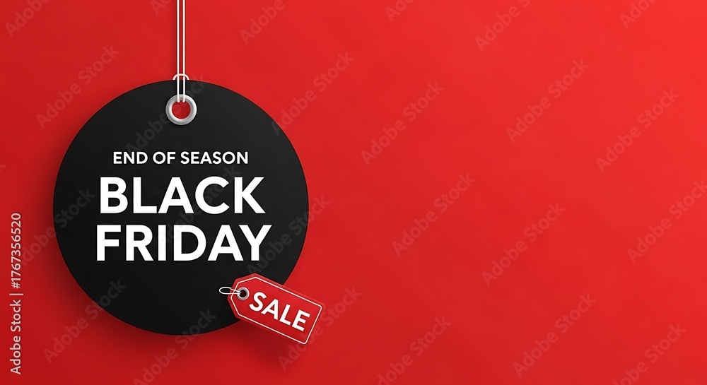 Photo of black friday sale tag hanging on a red background with the words end of season and black friday on the tag, and a small red sale tag #1767356520