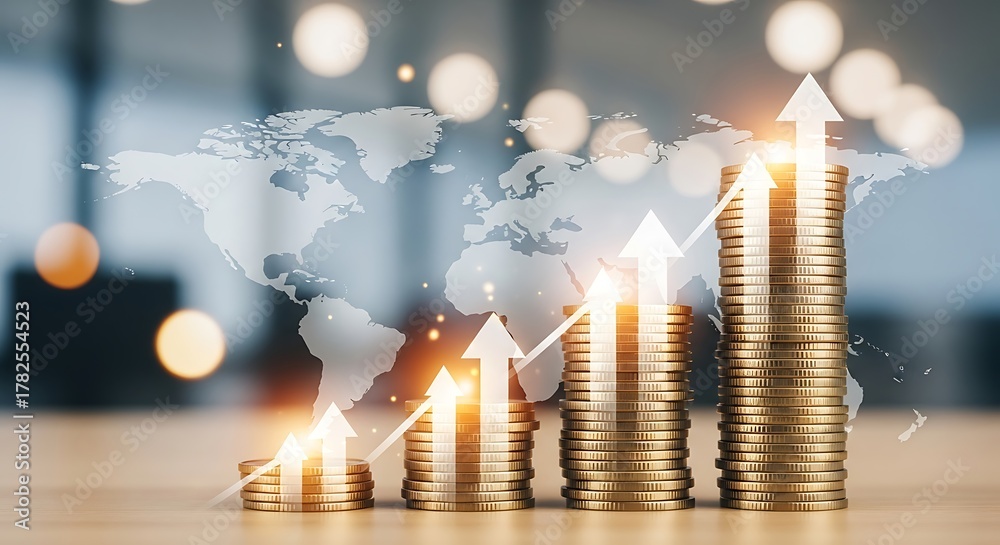 Photo of global financial growth illustrated by rising stacks of coins and upward arrows against a world map backdrop #1782554523