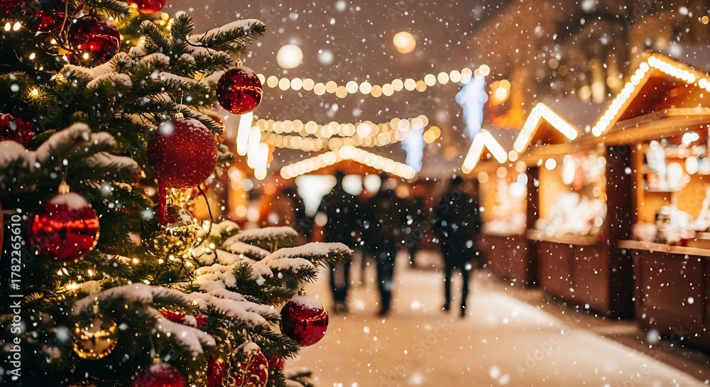 Photo of snowy christmas market with decorated tree and stalls, festive winter atmosphere with falling snow and bokeh lights #1782265610