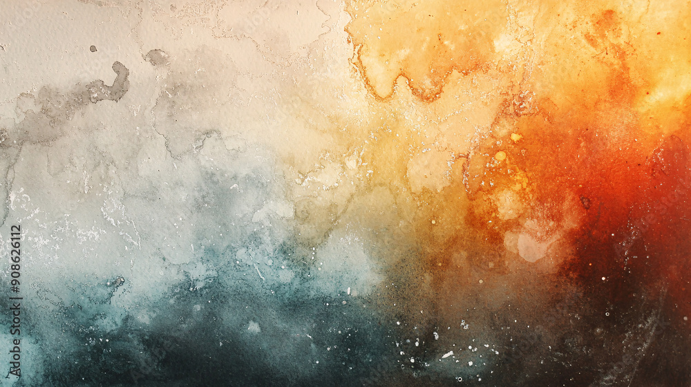 Photography of a watercolor artwork drying on a flat surface, with 4K detail showcasing the beautiful textures and the blending of colors as they settle on the paper #908626112