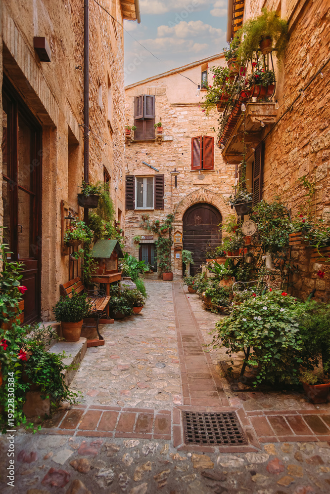 Picturesque medieval courtyard street with flowers and arches #1922830384