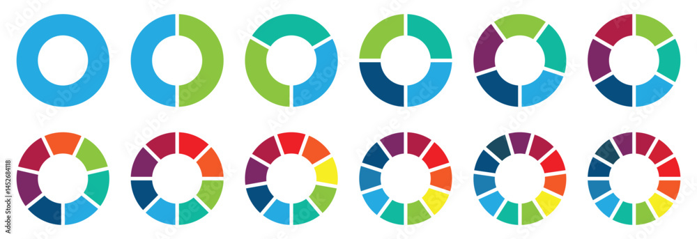 Pie chart color icons. Circle section graph. 1,2,3,4,5,6,7,8,9,10 segment infographic. Wheel round diagram part symbol. Segment slice sign. Wheel division into fractions, sectors. Vector illustration. #1452684118