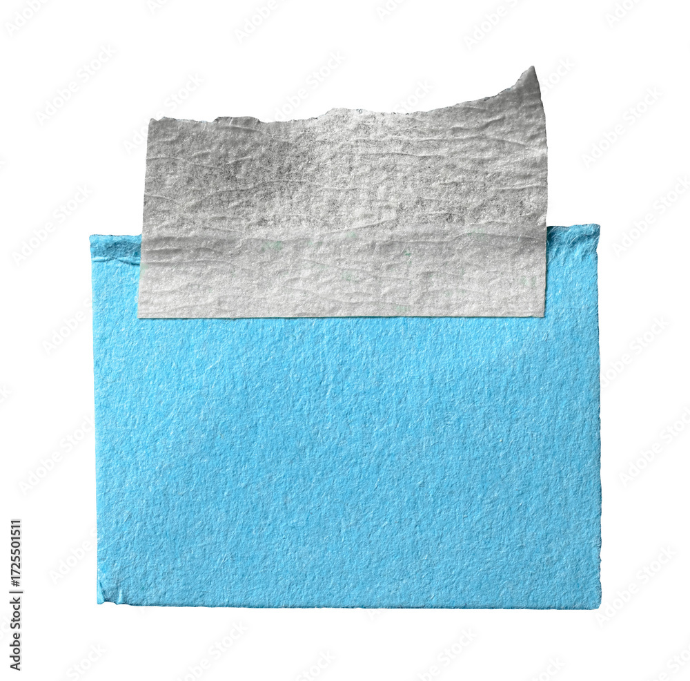 Piece of blank blue paper memo note with texture and adhesive sticky tape with copy space for text, isolated transparent png background design element #1725501511