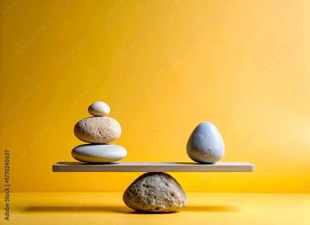 Piedras en equilibrio sobre una tabla de madera con fondo liso, concepto de armonía, estabilidad balance en la naturaleza y en la vida, bienestar, desarrollo personal y salud mental #1770245637