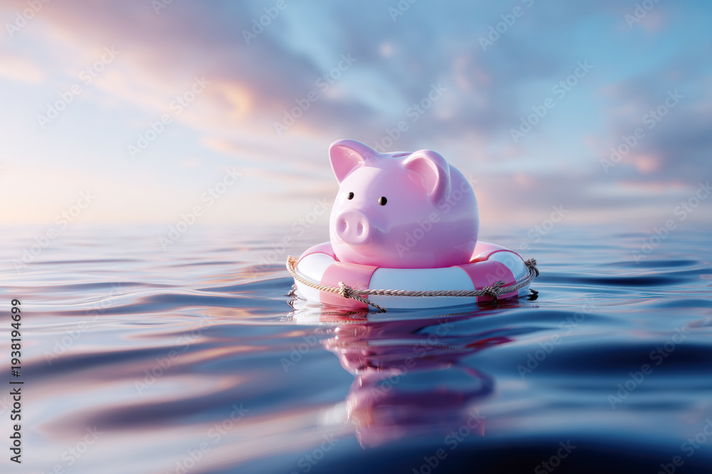 Piggy bank floating on ocean protected by lifebuoy, symbolizing finance, savings, investment, and economic stability #1938194699