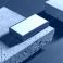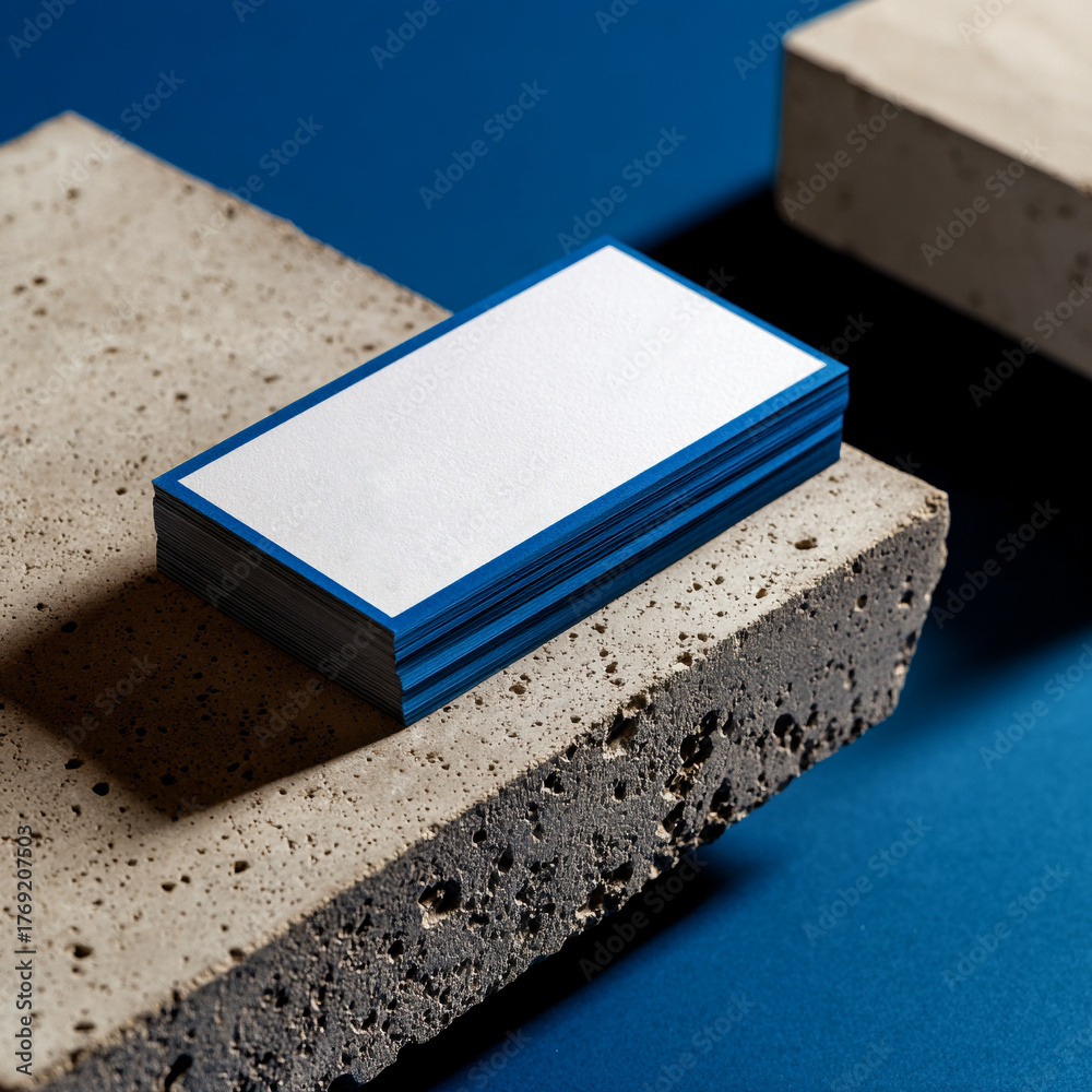 Pila de tarjetas blancas con borde azul sobre bloques de cemento en fondo azul minimalista y moderno #1769207503