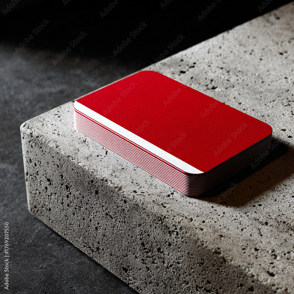 Pila de tarjetas rojas con esquinas redondeadas sobre bloque de cemento gris en fondo oscuro minimalista #1769207550