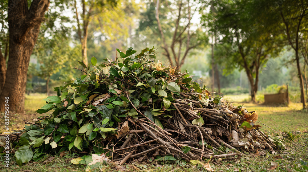 Pile of garden waste with green leaves, branches, and dry plant material. Natural organic debris representing gardening, yard cleanup, composting, and sustainable outdoor maintenance. #1837756946