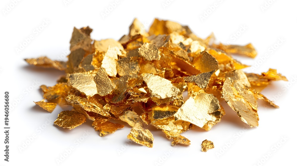 Pile of Golden Flakes Scattered on a White Background. #1946056680