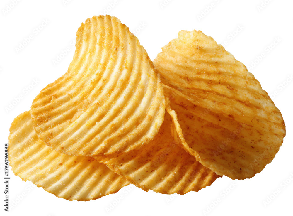Pile of golden ridged potato chips with wavy texture, isolated on transparent background #1766296838
