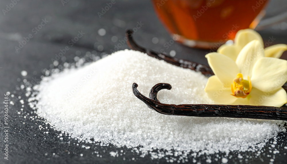 Pile of white sugar with vanilla beans and a yellow orchid on a dark surface granulated sugar #1934046185
