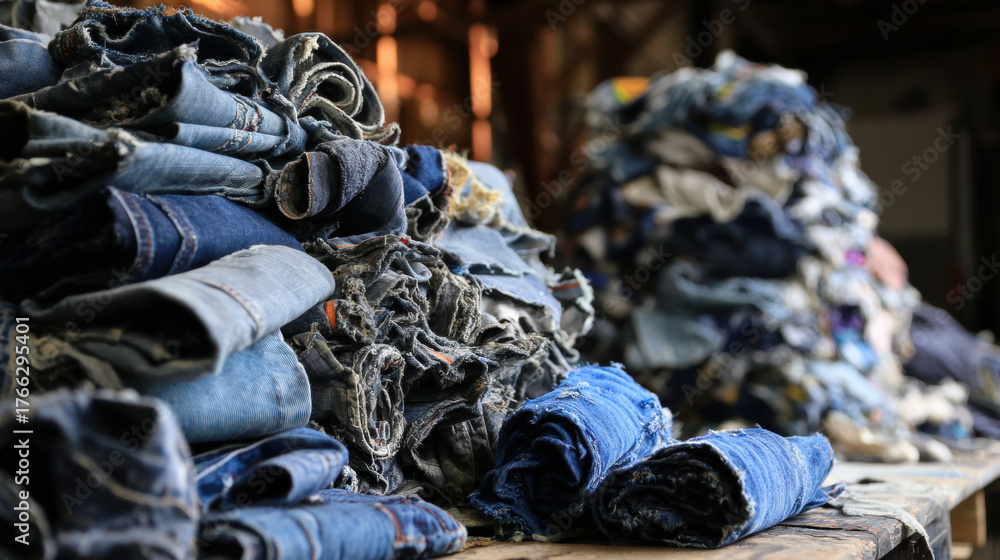 Piles of denim scraps sorted for upcycling and sustainable reuse in workshop with various shades of blue fabric stacked #1766295401