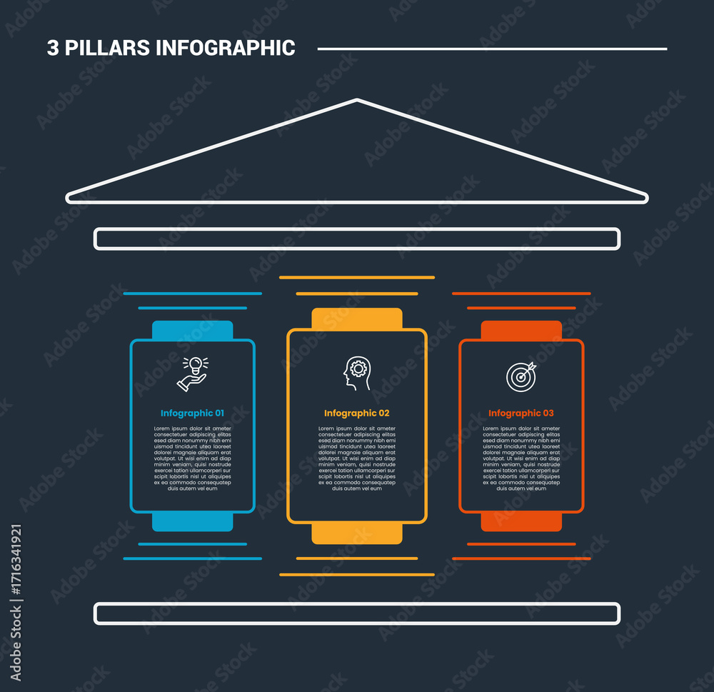 3 pillars infographic process diagram with simple structure with round spotlight container box with dark background bright outline style 3 points #1716341921