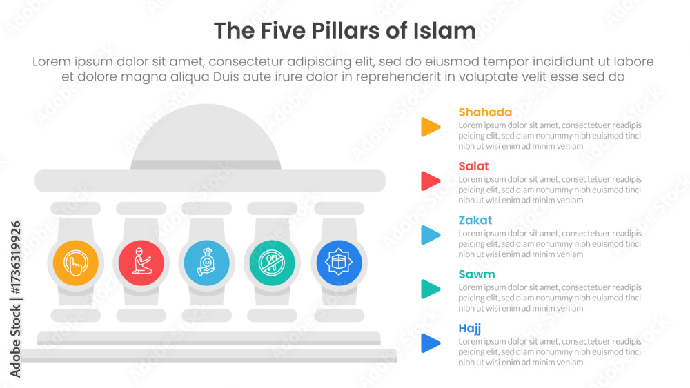 5 pillars of islam infographic template banner with round building and circle pillar badge for slide presentation #1736319926