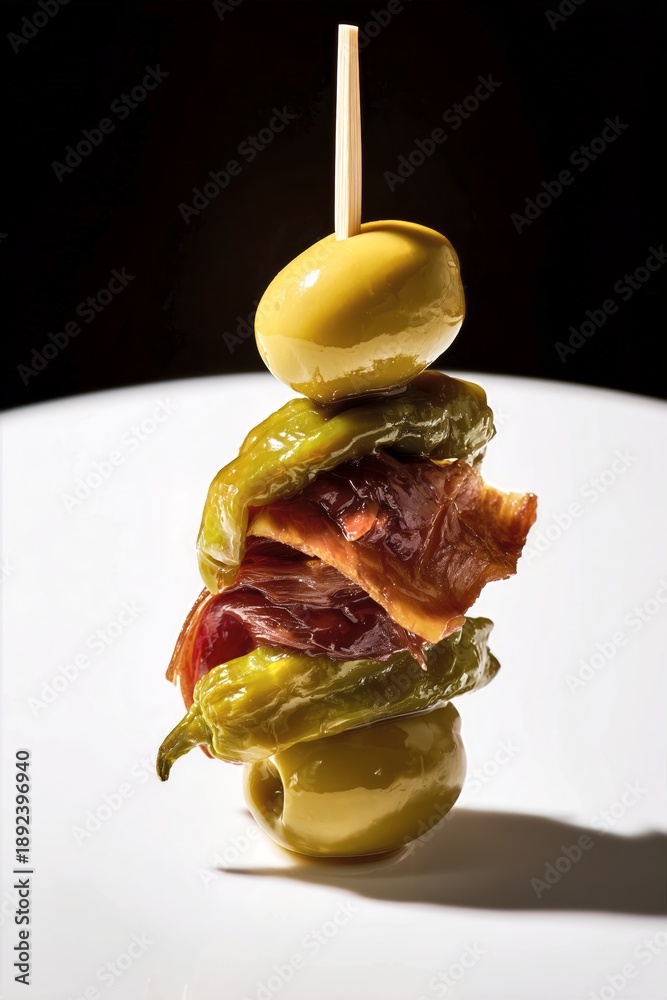 Pincho gilda tradicional aceituna guindilla anchoa, Pincho gourmet español de lujo aperitivo elegante, Fondo para publicidad de bar con pincho gilda espacio para texto #1892396940