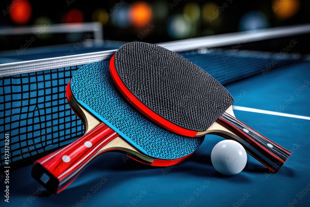 Ping pong paddles and ball resting on a vibrant table, ready for an exciting game in an indoor arena #1573178261