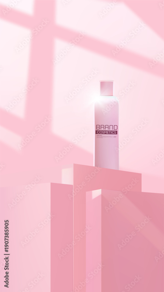 Pink Cosmetic Bottle Mockup on Minimal Podium with Soft Window Shadow Cast on Pink Wall #1907385905