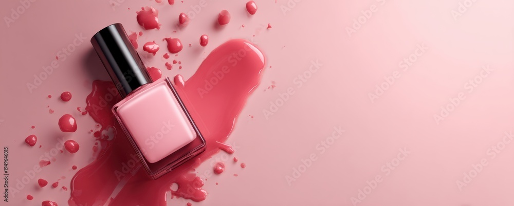 Pink nail polish bottle with glossy finish lying on a pink surface surrounded by splatters and droplets of matching nail polish, close-animated movie shot #1949646815