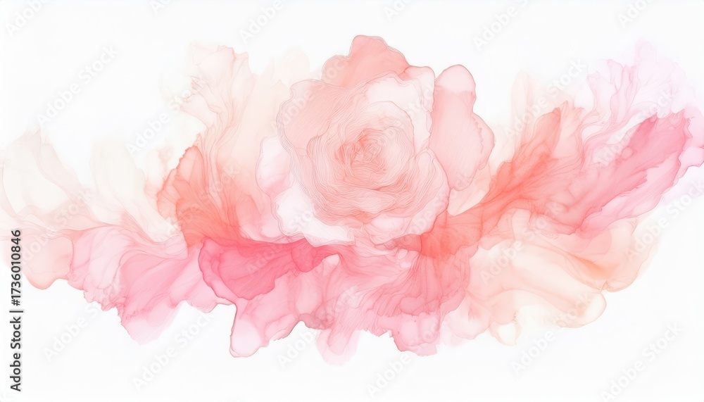 pink watercolor rose bloom illustration with translucent petals and soft white backdrop creating romantic spring ambience and generous copy space for elegant banner or floral wallpaper #1736010846