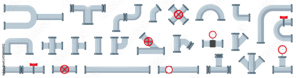 Pipe collection with steel joints, gauges and red valves. Industrial plumbing system elements suitable for construction or factory #1761846852