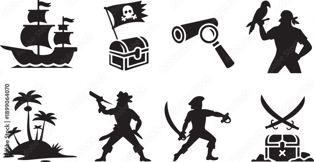 Pirate Icons Collection: Ship, Treasure Chest, Telescope, Parrot, Island, Swords Isolated on white background #1899064070