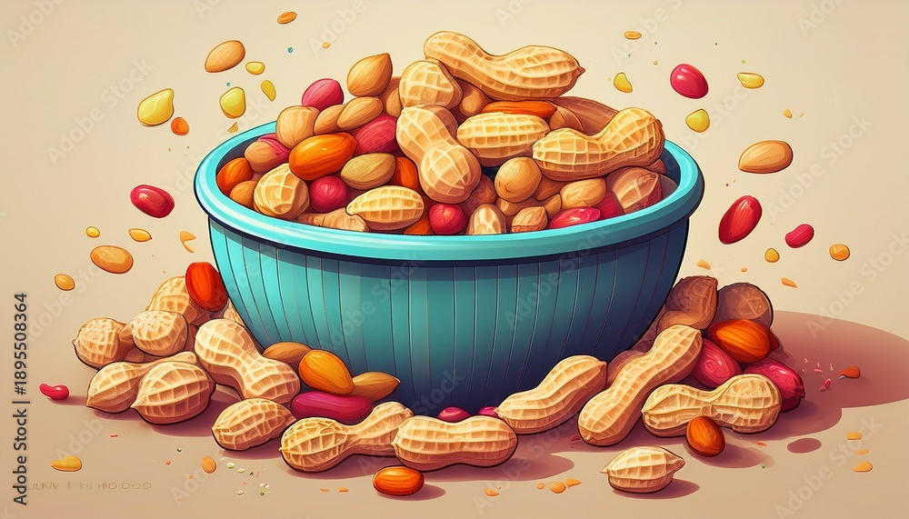 pixel art bowl filled with peanuts and scattered peanuts around on a light background with small colorful shapes floating #1895508364