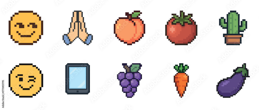 Pixel art emojis and items: smiley faces, food, and objects in retro design #1770451795