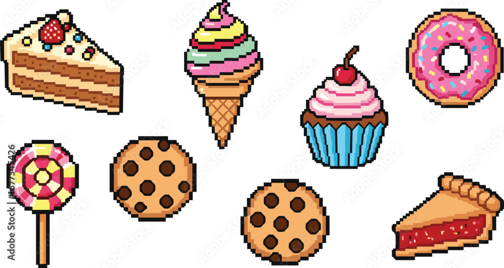 Pixel art image of cake, ice cream, cookies and donut. Sweets, pixelated, treats, dessert, retro, vintage, digital art. #1677345426