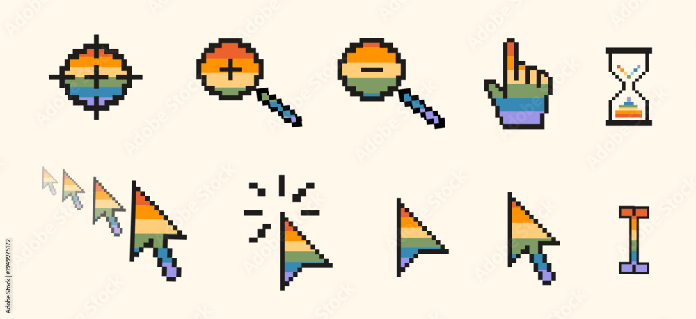 Pixel art retro computer cursor icon set in rainbow pride colors. Inclusive 8-bit nostalgic LGBTQ UI elements. Mouse pointers, hourglass, magnifying glass for digital pride events. Vector illustration #1949975172
