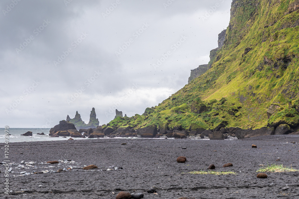 Plage de sable noir de Víkurfjara, avec les aiguilles basaltiques de Reynisdrangar au loin, à Vík í Mýrdal, dans le sud de l'Islande #1702473970