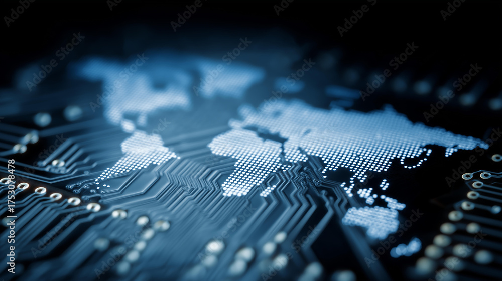 Planetary outline etched on a silicon wafer, global trade semiconductor flows, economic diplomacy in chip supply chains, international relations through tech trade, cross-border mi #1753078478