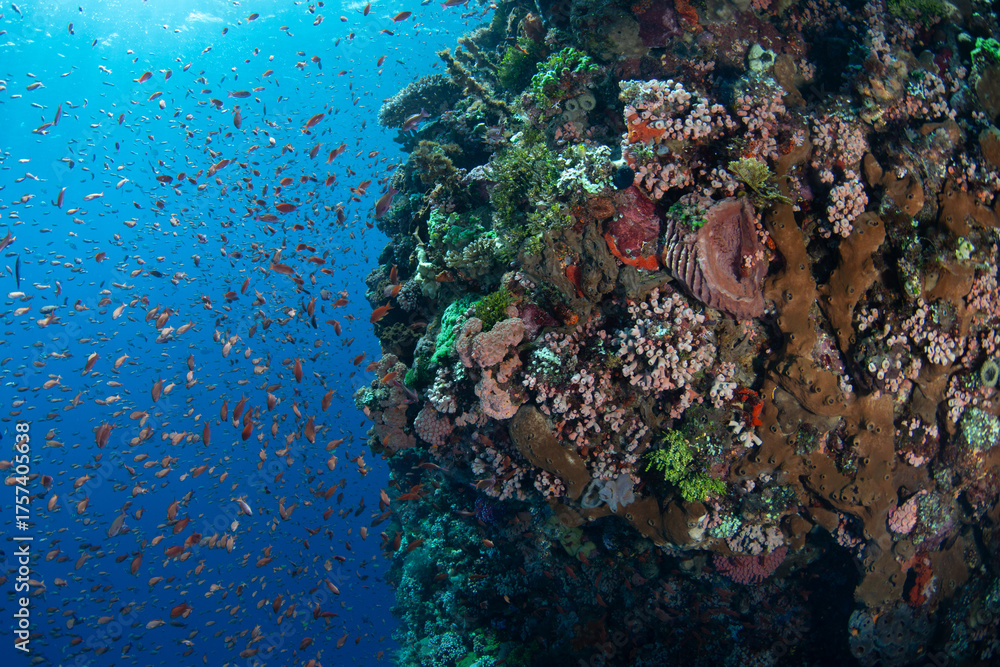 Planktivorous reef fish flourish along the edge of a beautiful coral reef in Alor, Indonesia. This scenic part of the Lesser Sunda Islands harbors extraordinary marine biodiversity. #1757405638