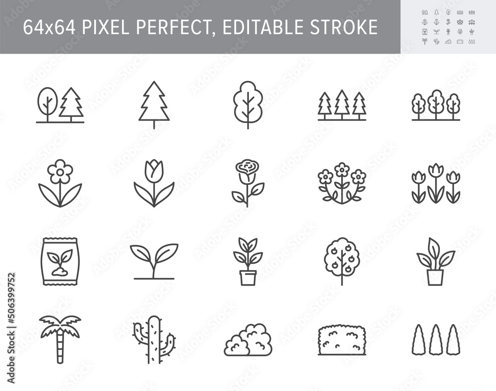 Plants line icons. Vector illustration include icon - green fence, houseplant, forest, seedling, wildflower, cactus outline pictogram for garden, tree and bushes. 64x64 Pixel Perfect, Editable Stroke #506399752