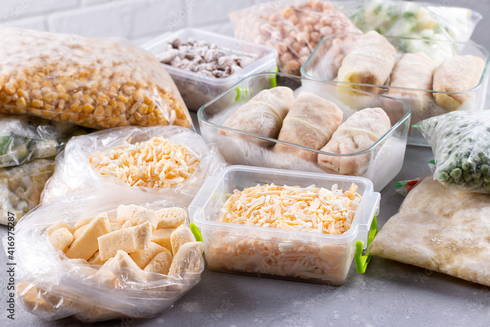 Plastic bags and containers with different frozen products, vegetables and meat #416975287