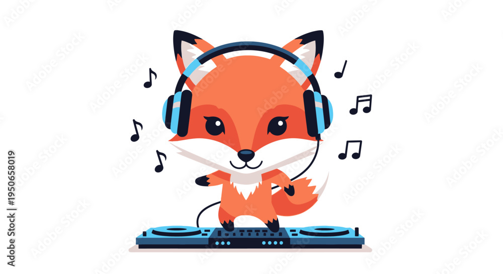 Playful cartoon fox DJ wearing headphones spinning records with musical notes and vibrant colors. #1950658019