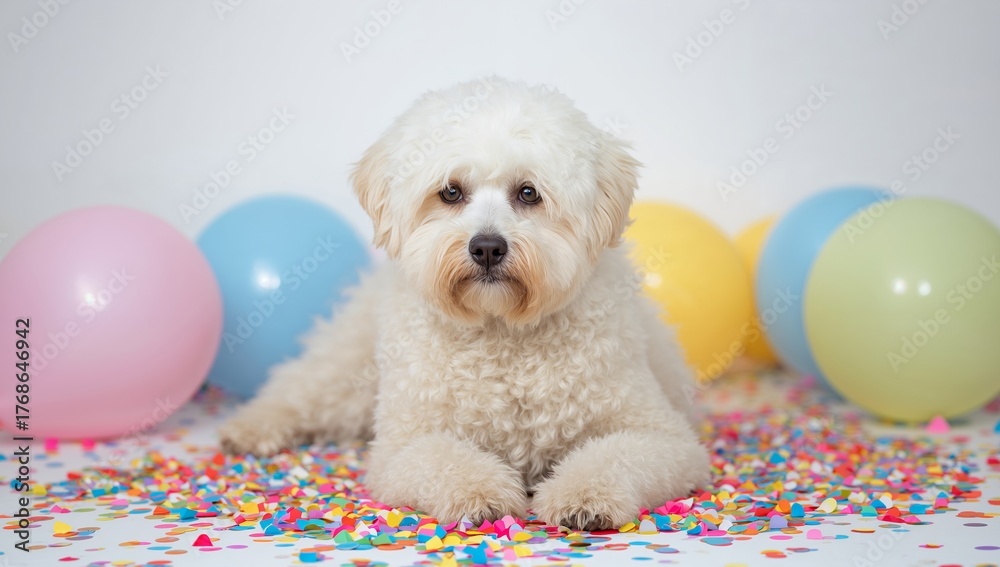 Playful Pup Amidst a Colorful Celebration, a Flurry of Confetti and Bright Balloons. #1768646942