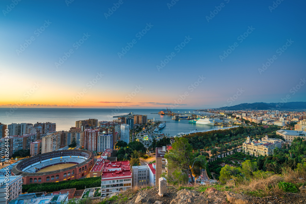 Plaza del toros and port of Malaga at dawn. Spain #1826414300