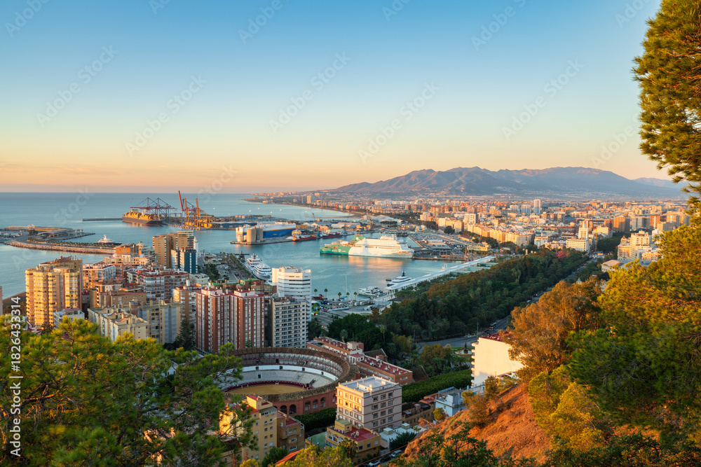 Plaza del toros and port of Malaga at sunrise. Spain #1826433314