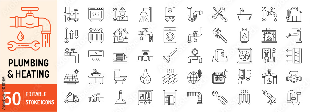 Plumbing and Heating collections editable stroke outline web icons set. Plumbing, heating, plumber, water, pipe, service, shower, repair, bathtub, leak, sewerage and more... Vector illustration #1458114609