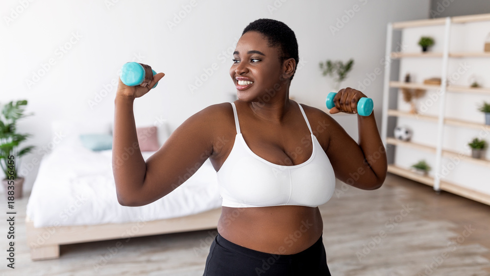 Plus size young black lady exercising with dumbbells at home during covid lockdown, banner design. Happy overweight Afro woman strengthening arm muscles, having weight loss training indoors #1883556455
