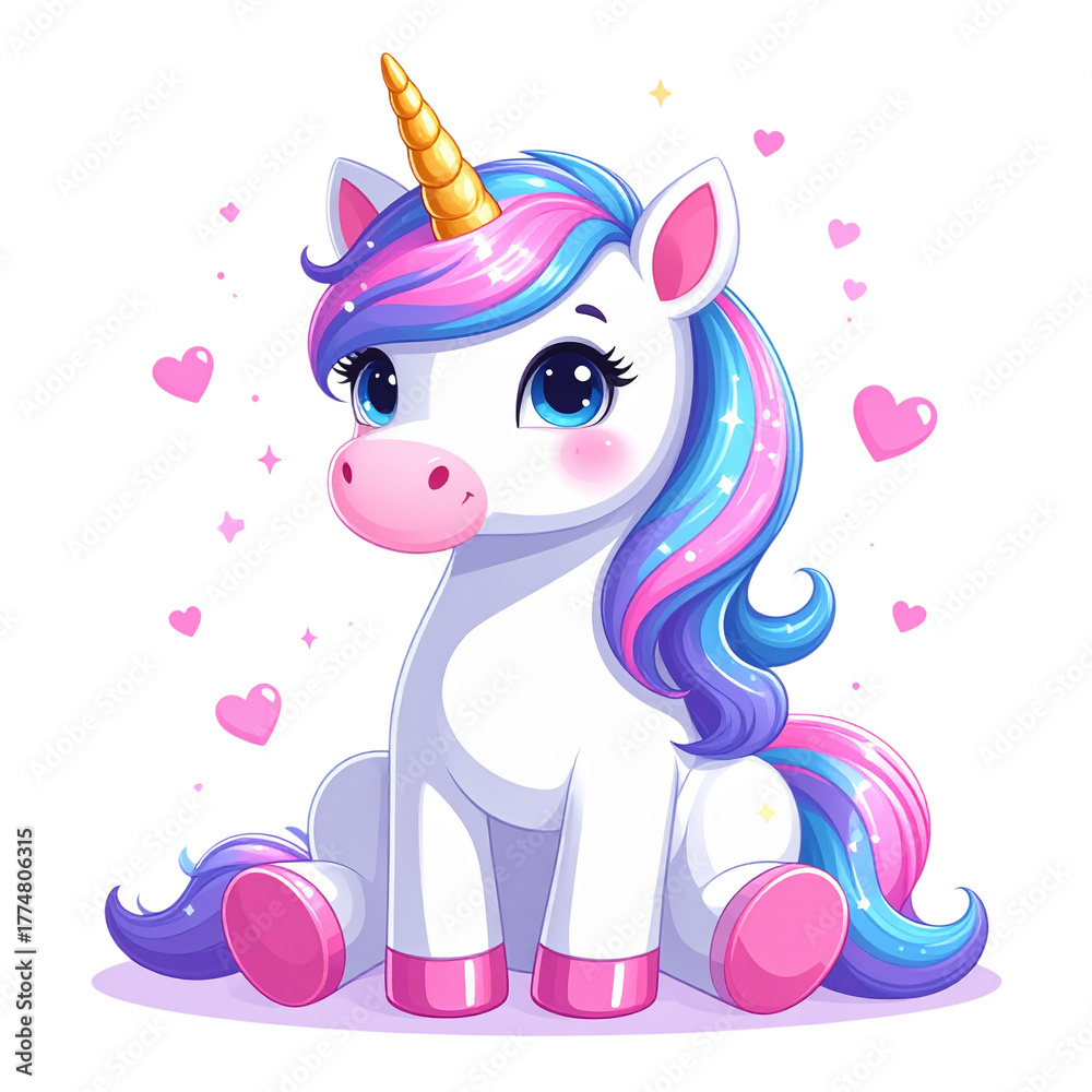 PNG vector of a baby unicorn sitting with sparkling hearts and trail of magic. Delightful, whimsical, perfect for children’s books #1774806315