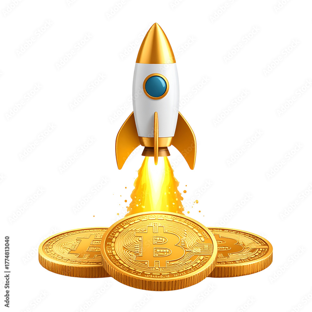 PNG vector of bitcoin coin with rocket blasting off, symbolizing rapid cryptocurrency growth and digital finance surge, perfect for tech and blockchain themed projects #1774813040