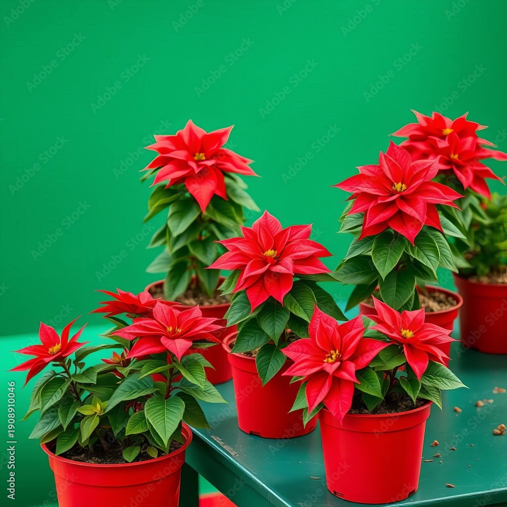 Poinsettia plants in red pots on a green table, table, ||christmas #1908910046