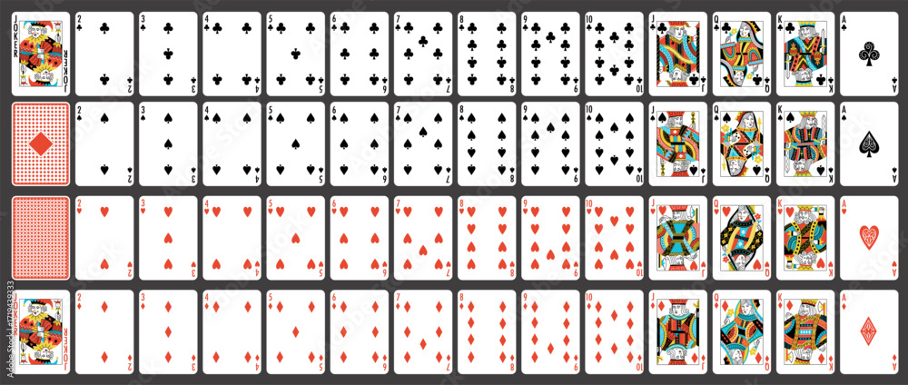 Poker cards. Royal flush in hearts, red ace and kings, gambling game and casino bet concept, playing cards game with 52 card deck. Vector set #1719439333
